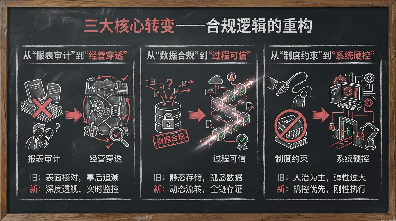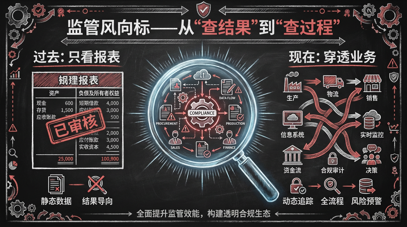 可监管的视角,早已天翻地覆。这一轮监管变革,核心是合规底层逻辑的彻底切换——不再只盯着最终结果,而是要穿透整个业务过程;不再死磕财务报表数字,而是要深入企业每一条经营链路的肌理。
