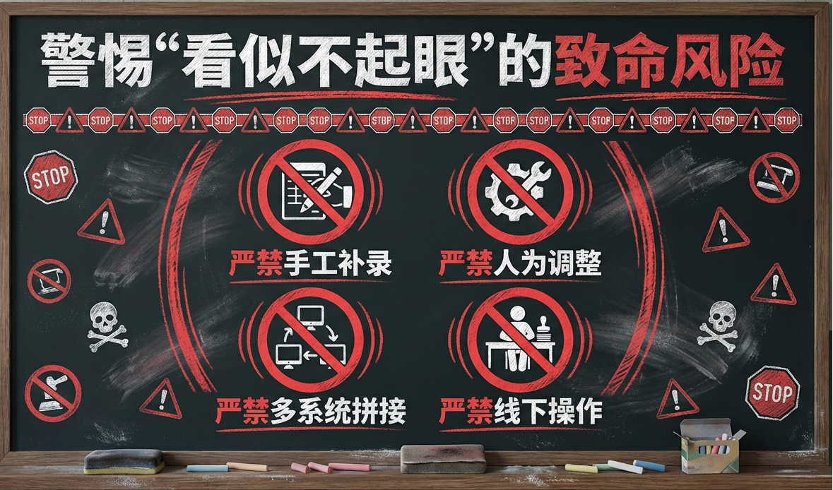 绝对不允许手工补录线下台账、事后补单,如今一律被列为高风险行为,监管一查一个准;绝对不允许人为调整财务调账、业务改数需全程留痕且有合理依据,随便改动一个数字都可能埋下隐患;绝对不允许多系统拼接业务、财务、税务数据各自为战,靠人工对账凑数,直接触碰监管红线。