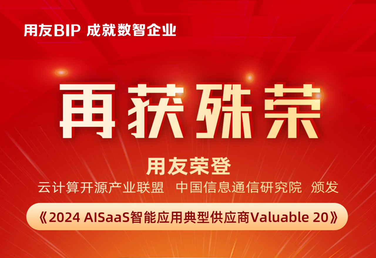 用友荣登中国信通院《2024 AISaaS智能应用典型供应商Valuable 20》榜单